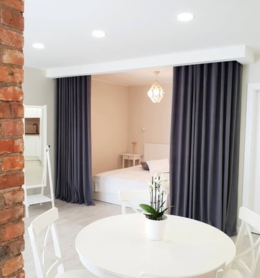 Užuolaidų, kaip pertvarų naudojimas yra labiau paplitęs ir universalesnis sprendimas, nei galėtumėte pagalvoti. Užuot statę sienas, galite lengvai pakabinti užuolaidas ir taip atskirti kambarių erdves. Tai yra geras sprendimas, pritaikytas įvairiems interjero poreikiams.